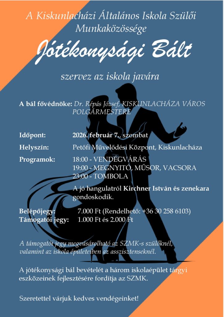 A Kiskunlacházi Általános Iskola Szülői Munkaközössége jótékonysági bált szervez az iskola javára. A bál fővédnöke: Dr. Répás József, Kiskunlacháza város polgármestere Időpont: 2026. február 7. (szombat) Helyszín: Petőfi Művelődési Központ, Kiskunlacháza